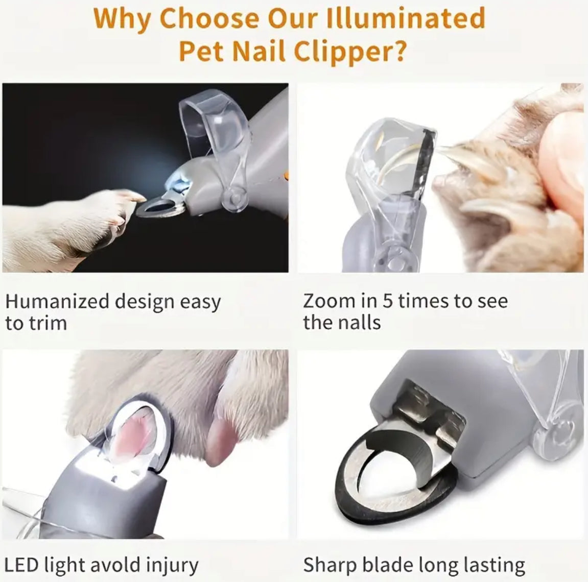 - Keep your furry friend's claws in tip-top shape with these versatile nail clippers designed for both cats and dogs. Featuring built-in LED lights for precision trimming, these scissors make grooming sessions easier and safer. Includes handy cleaning supplies to maintain your tools in perfect condition. Say goodbye to overgrown nails and hello to happy paws!
