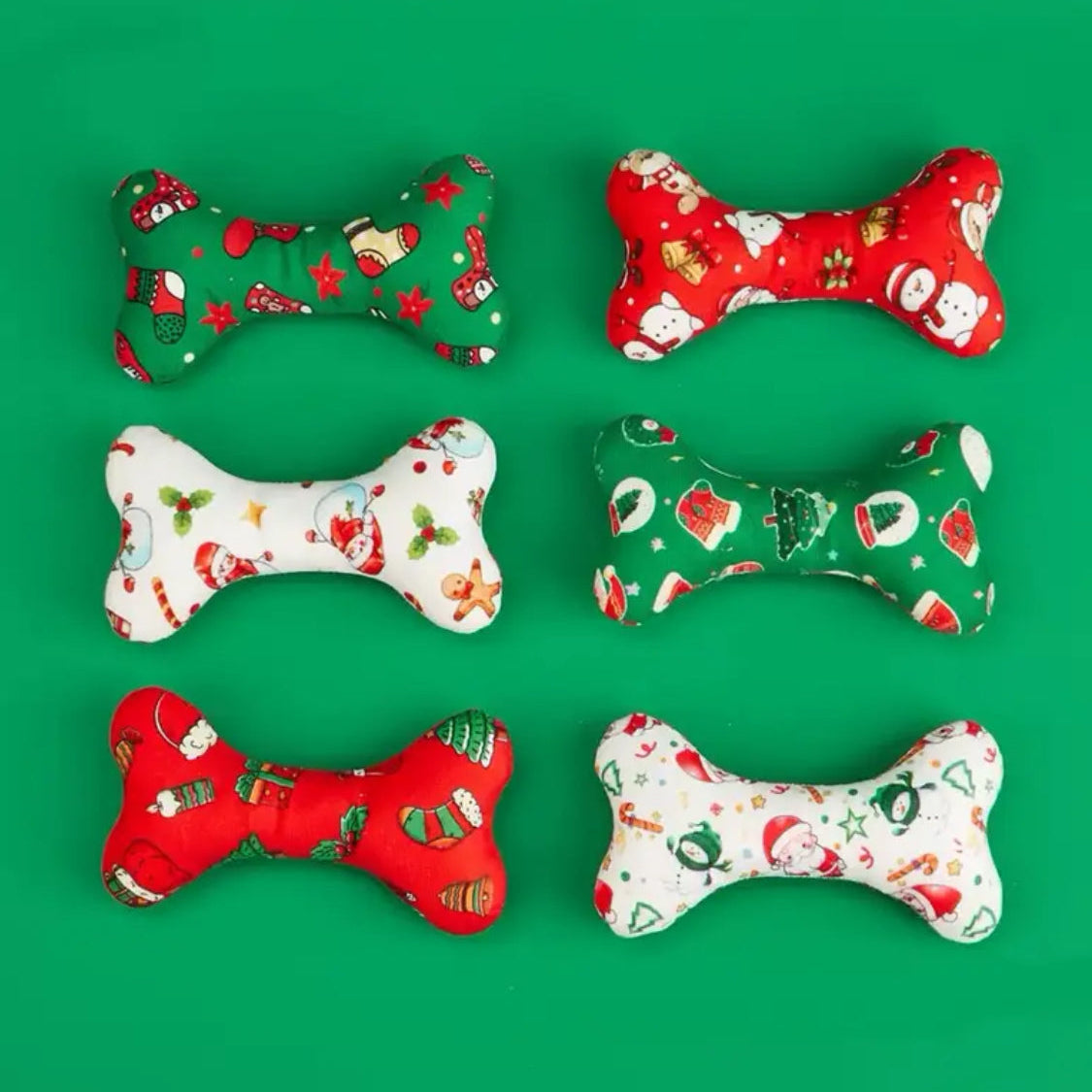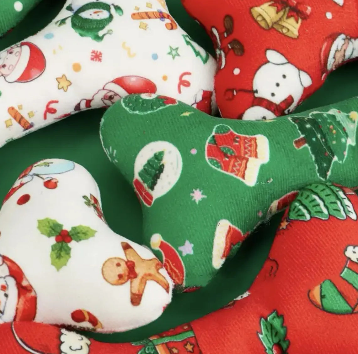 - Squeaky Dog Toy Bone-Shaped Plush Chew Toy with Squeaker - Interactive Crinkle Sound, Durable Soft Safe for Puppies & All Breeds, Christmas Puppy Gift with Bone Patterns & Squeaker for Training, Teething, Tug-of-War Games (Red/Green)